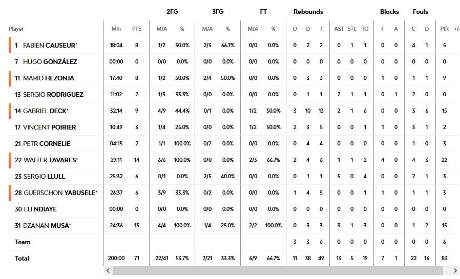 Ο Ουίλιαμς έγραψε το 34-32 (17’), ο Ταβάρες το 34-36 (17’25’’) και ο ίδιος έριξε την αυλαία στο πρώτο μισό με το 37-38 σε ένα εικοσάλεπτο στο οποίο καταγράφηκαν συνολικά 14 αλλαγές στο προβάδισμα! Ο σέντερ της Ρεάλ ήταν και από τα μεγαλύτερα ατού για τον Τσους Ματέο, κάτι όχι και τόσο περίεργο, κλείνοντας αυτό το πρώτο μισό με 8 πόντους, χωρίς να χάσει σουτ, σε κάτι περισσότερο από μια ντουζίνα λεπτά συμμετοχής.