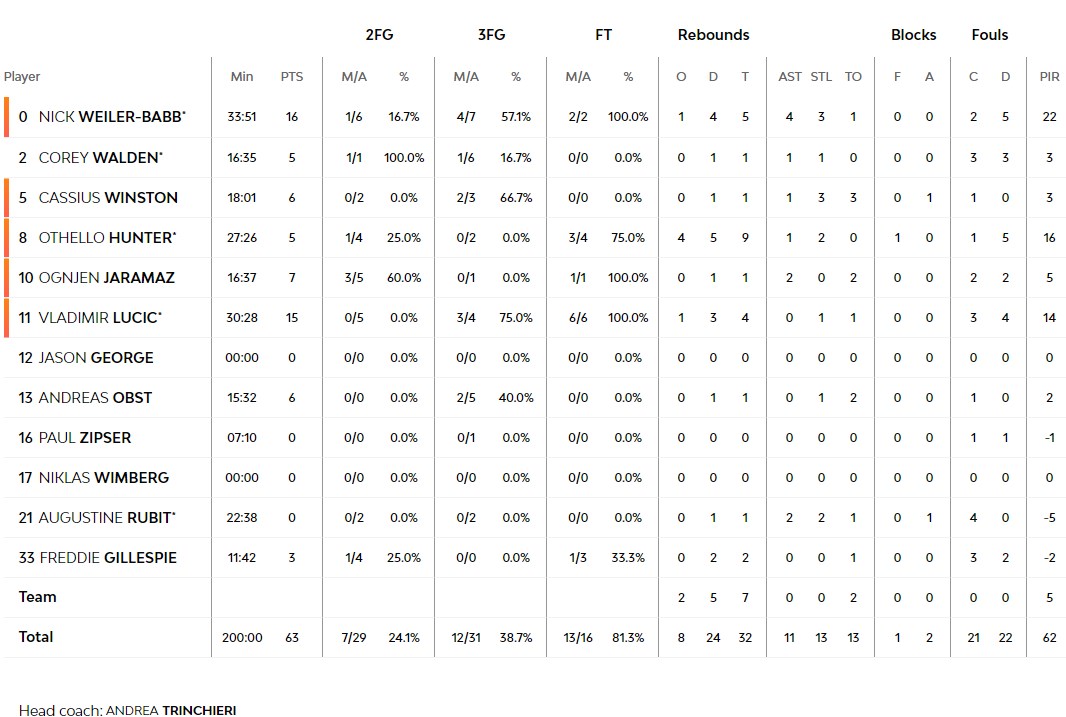 Από τη Βίρτους ξεχώρισε ο Λούντμπεργκ με 13 πόντους, ενώ από τη Μπάγερν πρώτος σκόρερ αναδείχθηκε ο Λούσιτες με 15 πόντους.