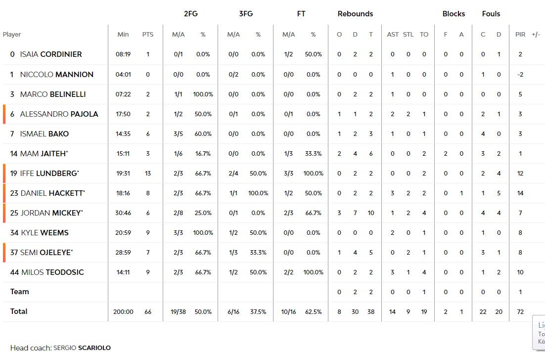 Η ιταλική ομάδα μπήκε καλύτερα στο ματς και έχοντας την πρωτοβουλία των κινήσεων προηγήθηκε με 13-7 έπειτα από τρίποντο του Χάκετ, με το χρονόμετρο να δείχνει 6' από την έναρξη της αναμέτρησης. Το πρώτο δεκάλεπτο τελείωσε με σκορ 24-16 και τους ασπρόμαυρους να έχουν τα ηνία του ματς.