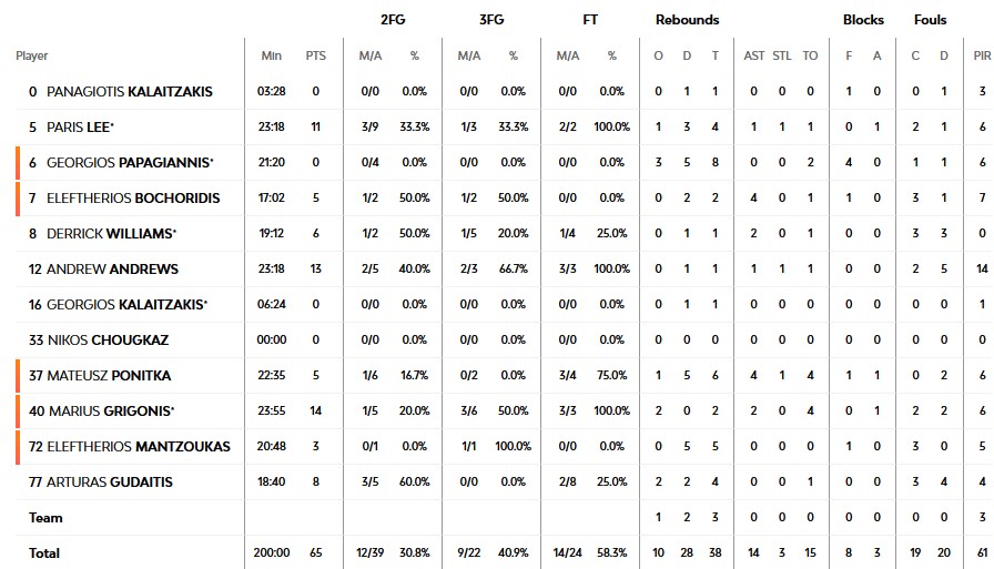 O Γκριγκόνις έγραψε το 66-50 (31'20''), αλλά η απάντηση ήρθε άμεσα με τη διαφορά να "σκαρφαλώνει" πάνω από τους 30 πόντους (85-54, 35'20'') μετρώντας 12/24 τρίποντα με τον αγώνα να ολοκληρώνεται με το τελικό 94-65.