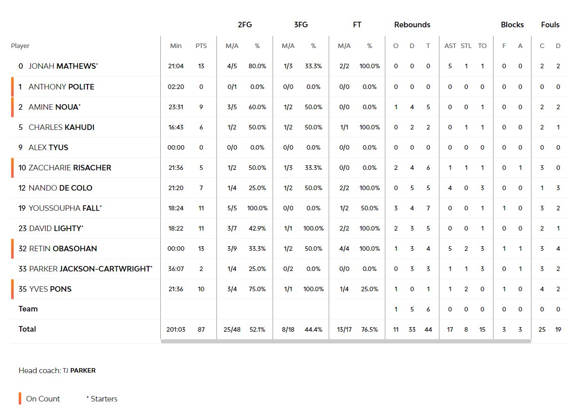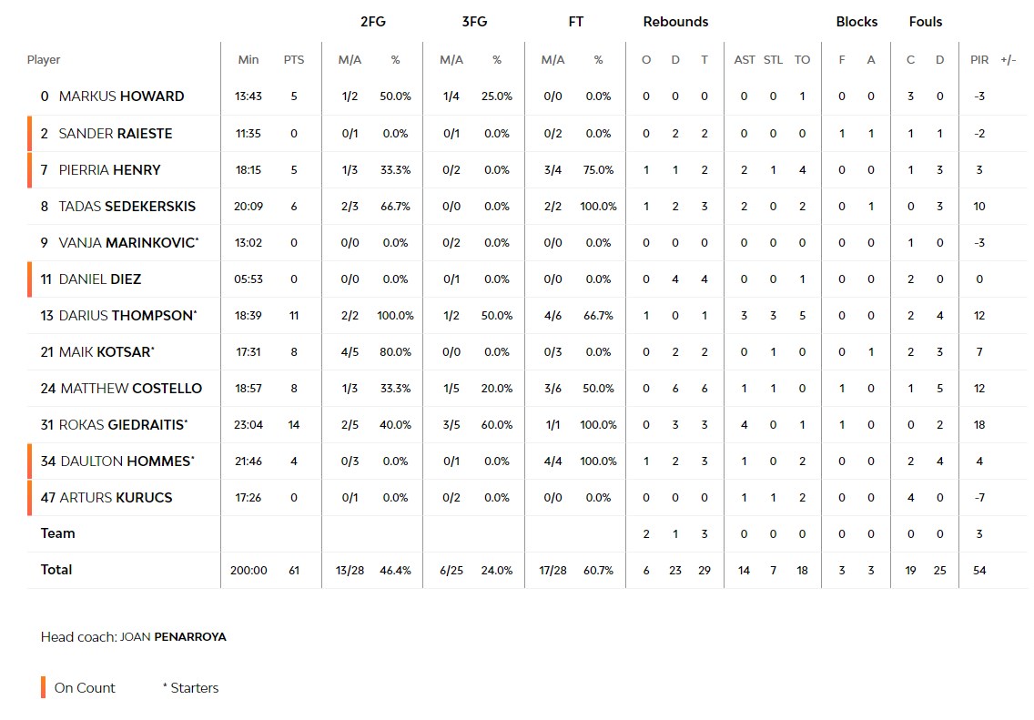 Από τη Βιλερμπάν ξεχώρισαν οι Ματιέ και Τζάκσον - Κάρτραϊτ με 13 πόντους έκαστος , ενώ από τη Μπασκόνια πρώτος σκόρερ αναδείχθηκε ο Γκιεντράιτις με 14.