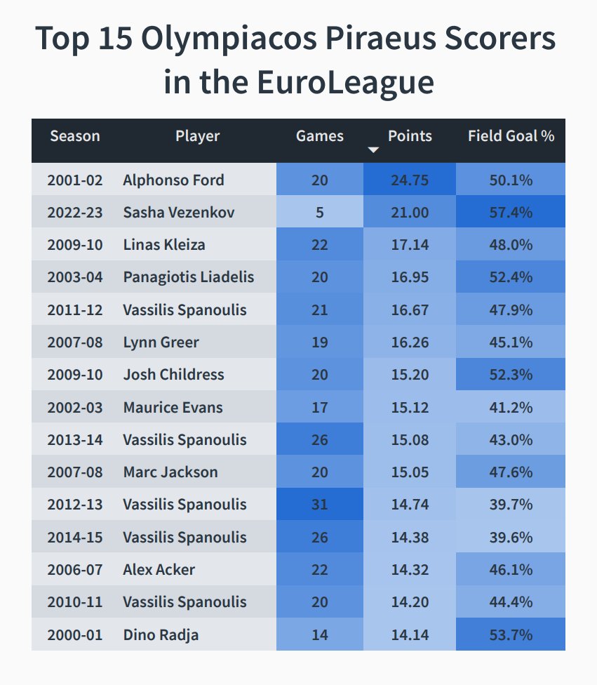 Δε σταματά να ξεχωρίζει ο Βεζένκοβ, με τον φόργουορντ των Πειραιωτών, να διακρίνεται στη δεύτερη θέση της λίστας και παρά το γεγονός ότι βρισκόμαστε μόνο στην 5η αγωνιστική της Euroleague, διαφαίνεται να μπορεί να φτάσει σε ένα ακόμα σπουδαίο επίτευγμα.