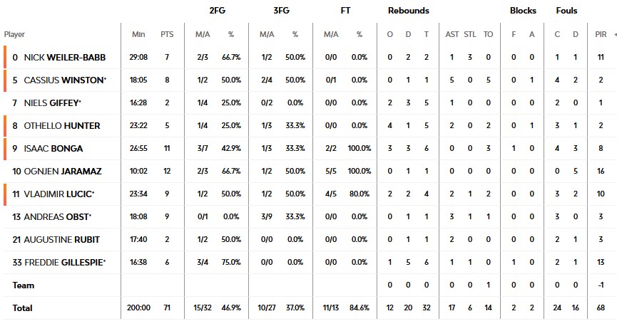 Η ομάδα του Αντρέα Τρινκιέρι δεν σταμάτησε να παλεύει με τον Γουίνστον πλησίασε και πάλι στους τέσσερις (65-69, 35'45''). Οι πρώτοι τρεις πόντοι του Λαρεντζάκη στο παιχνίδι διαμόρφωσαν το 65-74 (37'20''), για να πέσει η αυλαία με το τελικό 71-82.