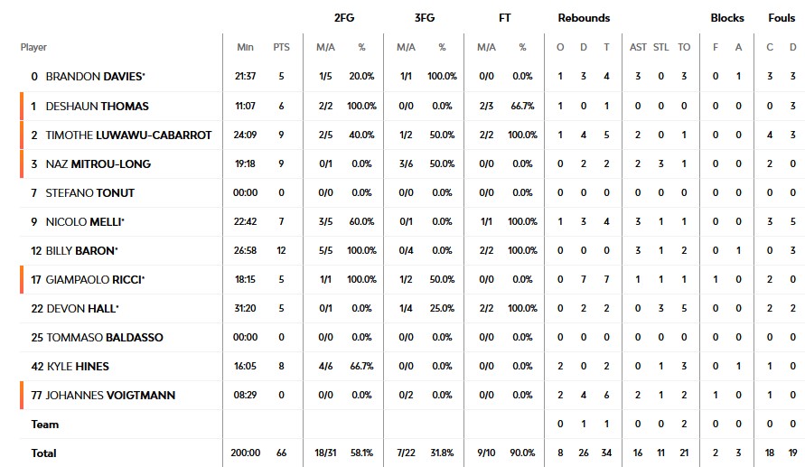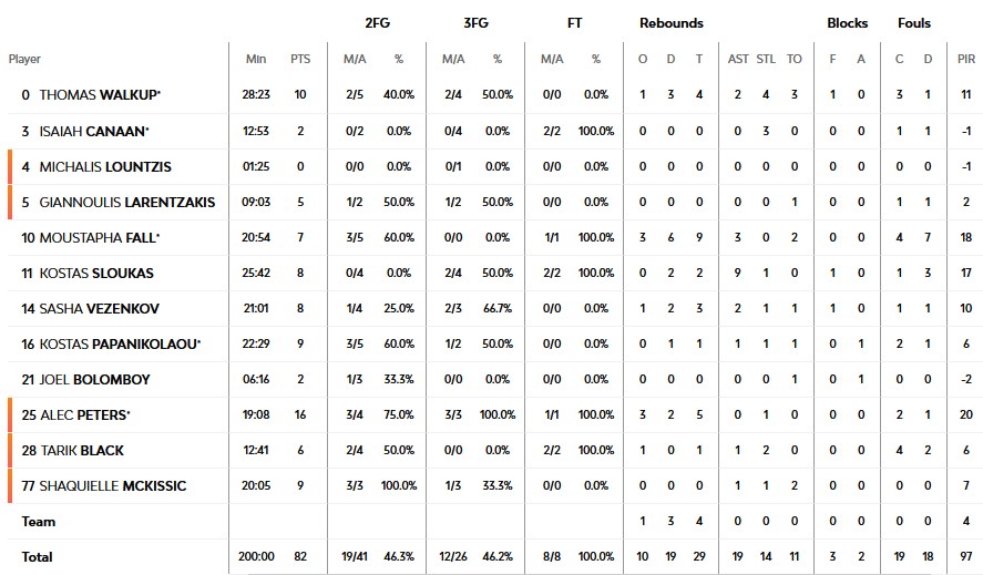 Η μεγαλύτερη διαφορά: +22 (72-50, 36') για τον Ολυμπιακό, +4 (0-4, 2’) για την Αρμάνι Μιλάνο