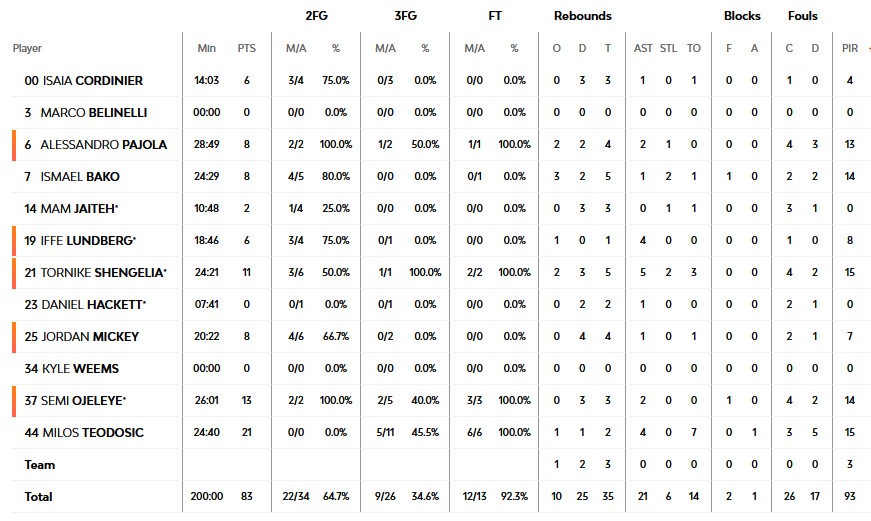 Η μεγαλύτερη διαφορά: +3 (33-30, 17’) για την Βίρτους Μπολόνια. +12 για τον Ολυμπιακό (51-63, 29'45'')
