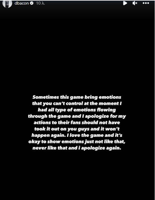 Ο Μπέικον ύψως το μεσαίο δάχτυλο του δεξιού του χεριού προς την κερκίδα, συνοδεύοντας την κίνησή του με ένα καθαρό «F… you». Το βίντεο έκανε το γύρο του διαδικτύου με μεγάλη ταχύτητα. Λίγο μετά το τέλος της αναμέτρησης ο «πράσινος» απολογήθηκε δημοσίως: "Μερικές φορές αυτό το παιχνίδι δημιουργεί συναισθήματα που στιγμιαία δεν μπορείς να τα ελέγξεις. Στη διάρκεια του παιχνιδιού είχα έντονα συναισθήματα και ζητώ συγνώμη για την κίνησή μου προς τους οπαδούς. Δεν έπρεπε να "ξεσπάσω" σε εσάς και δεν θα ξαναγίνει. Αγαπώ αυτό το παιχνίδι και είναι οκ να εκδηλώνεις τα συναισθήματά σου, απλά όχι με αυτόν τον τρόπο και ζητώ και πάλι συγνώμη".