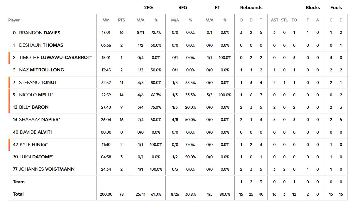 Οι Ιταλοί είδαν τον Τζίτζι Ντατόμε να αφήνει το γήπεδο χωλαίνοντας νωρίς στο παιχνίδι με το επόμενο πλάνο να τον δείχνει με πάγο στον αστράγαλο και ουσιαστικά εκτός αγώνα, αλλά ο παίκτης που μπήκε να τον αντικαταστήσει αποδείχθηκε… λίρα εκατό για τους Μιλανέζους. Ο Στέφανο Τονούτ είχε κάνει ήδη ρεκόρ καριέρας στην Ευρωλίγκα στην αρχή της δεύτερης περιόδου με 11 πόντους σε 13’26’’ στο παρκέ!