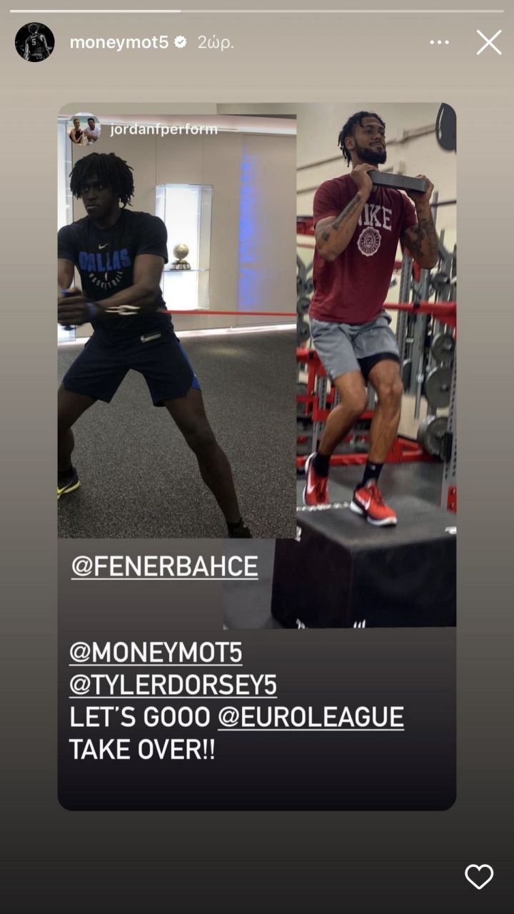 Ο αθλητής της Φενέρμπαχτσε ανέβασε μια φωτογραφία στην οποία είναι με τον Ντόρσεϊ σε ένα γυμναστήριο, με τον γυμναστή των δυο αθλητών να τους καλεί να... κυριαρχήσουν στην Euroleague.