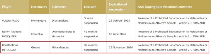 Ο Ντίνος Μήτογλου έχει τιμωρηθεί με ποινή αποκλεισμού 32 μηνών, όντας θετικός σε χρήση απαγορευμένων ουσιών και στην ιστοσελίδα της FIBA, βρίσκεται αναρτημένη, πλέον, η τιμωρία του Έλληνα διεθνή φόργουορντ, καθώς και η ουσία η οποία ανιχνεύθηκε στον οργανισμό του.