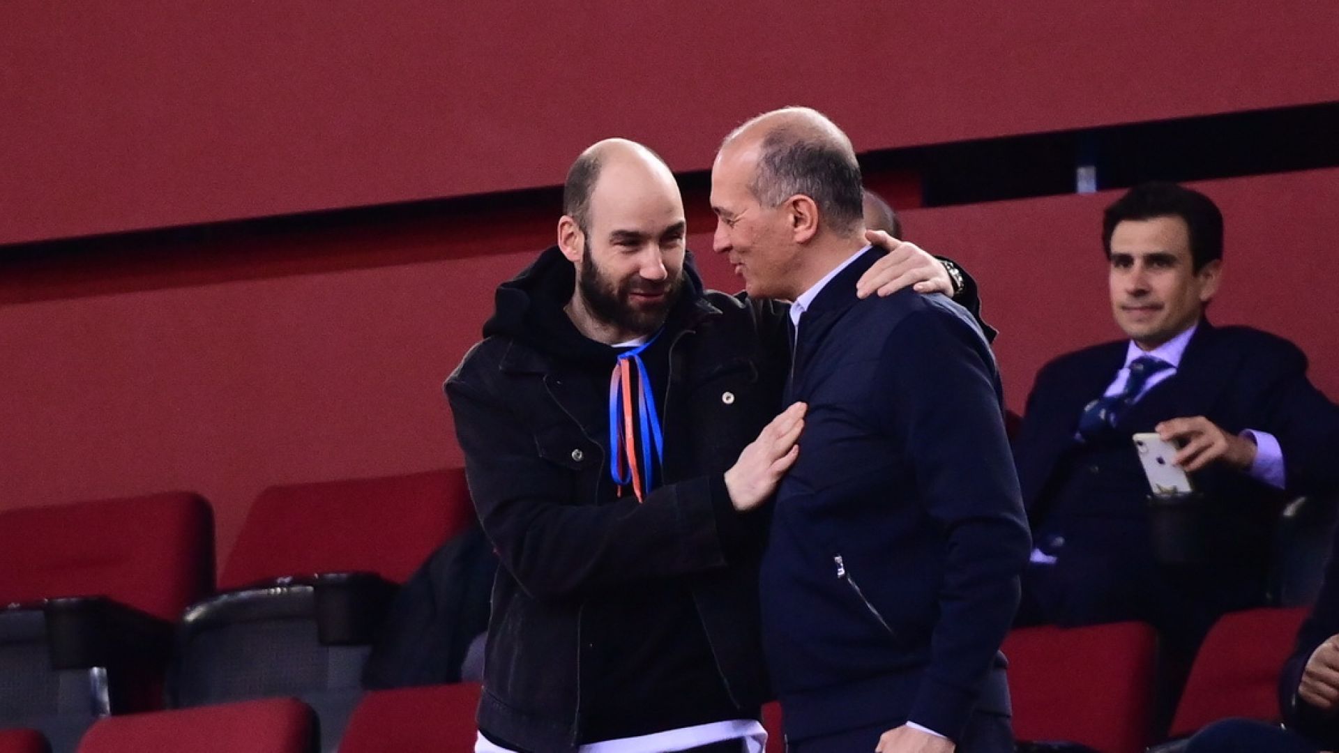 Ο θρύλος του Ολυμπιακού και νυν προπονητής του Περιστερίου, είχε θερμό εναγκαλισμό με τον πρόεδρο της ομάδας, Γιώργο Αγγελόπουλο, ενώ άκουσε το όνομα του να γίνεται, για ακόμα μία φορά, σύνθημα από την ερυθρόλευκη κερκίδα.
