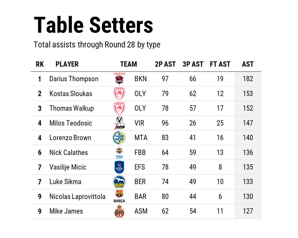 Πρώτος των πρώτων στη σχετική λίστα είναι ο Ντάριους Τόμπσον με 182 ασίστ εκ των οποίων οι 97 καταλήγουν σε δίποντο, οι 66 σε τρίποντο και οι 19 σε ελεύθερες βολές. Τέλος, στην 6η θέση της σχετικής λίστας βρίσκεται ο Νίκ Καλάθης, με τον Ελληνοαμερικανό γκαρντ να έχει δώσει 136 ασίστ.