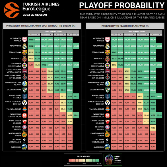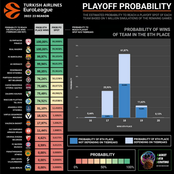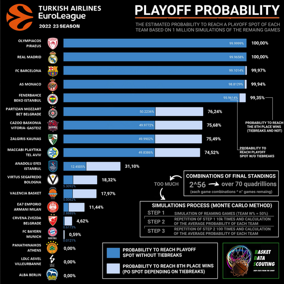 Έτσι, λίγα 24ωρα πριν την διεξαγωγή της 29ης αγωνιστικής, η σελίδα «Basket Data Scouting» δίνει τις δικές της προβλέψεις για τις ομάδες που θα συνεχίσουν την ευρωπαϊκή τους πορεία, βασισμένες στην μέχρι στιγμή πορεία των ομάδων, έχοντας μελετήσει 1 εκατομμύριο διαφορετικούς συνδυασμούς, από τους συνολικά 70 τετράκις εκατομμύρια διαθέσιμους!