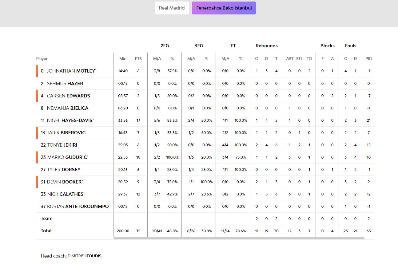 Από την Ρεάλ Μαδρίτης διακρίθηκε ο Μούσα με 16 πόντους, με τους Χάνγκα και Πουαριέ να σκοράρουν από 11 πόντους έκαστος. Από την Φενέρμπαχτσε ξεχώρισαν οι Χέις (5ρ. και 1 ασίστ) και Καλάθης (6ρ. και 6 ασίστ) με 17 και 12 πόντους αντίστοιχα, με τον Ντόρσει να βάζει έξι πόντους.
