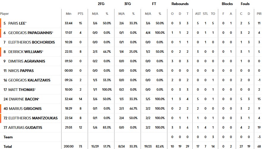 *Ο Ολυμπιακός αγωνίστηκε χωρίς τον Αϊζάια Κάνααν. Ο Παναθηναϊκός αγωνίστηκε χωρίς τους Μάριους Πονίτκα, Νέιτ Γουόλτερς, Παναγιώτη Καλαϊτζάκη. Ο Σερέλης αναγκάστηκε να παίξει στην πορεία του αγώνα και χωρίς τον Ματ Τόμας, ο οποίος αισθάνθηκε ενοχλήσεις στη μέση.
