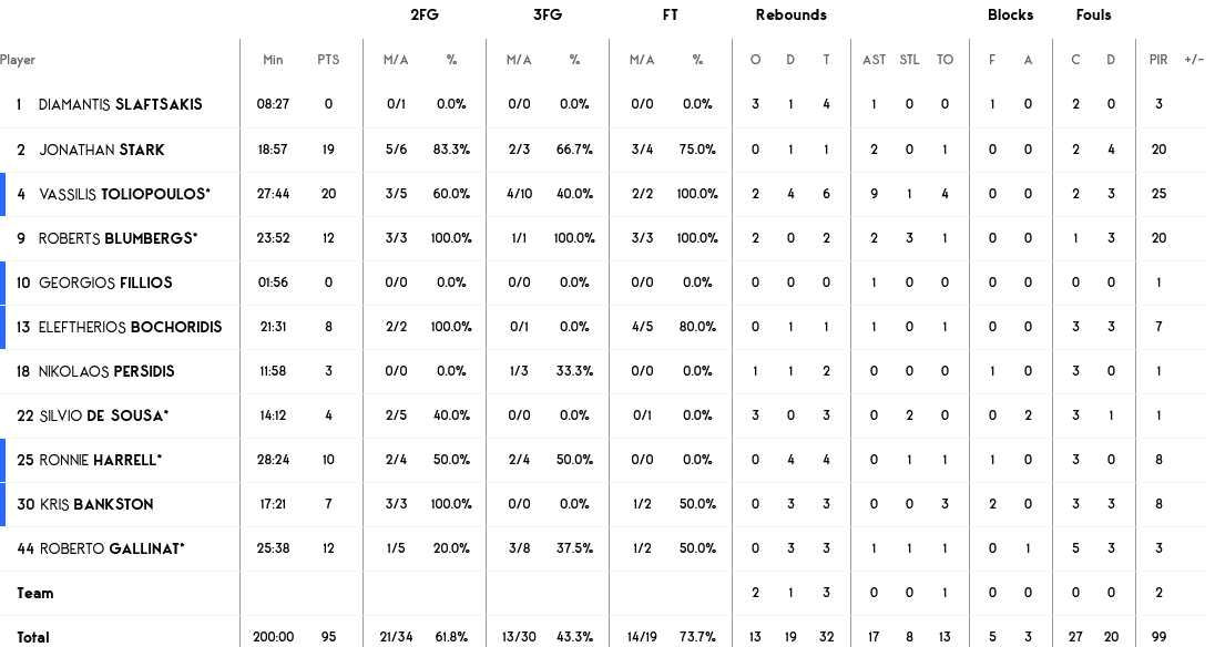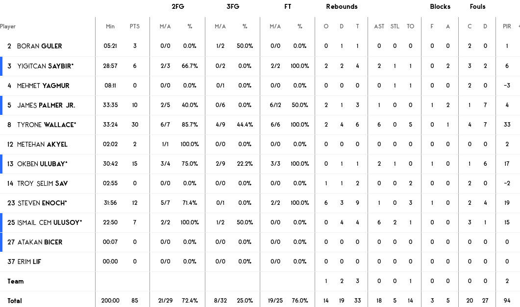 Ξεχώρισαν: Καταπληκτικός ο Σταρκ με 19 πόντους, με τους Γκάλινατ και Μπλούμπεργκ να έχουν από 12 έκαστος. Για την Τουρκ Τέλεκομ, στράφι πήγε η εντυπωσιακή εμφάνιση του Γουάλας, με 30 πόντους, έξι ριμπάουντ και ισάριθμες ασίστ.
