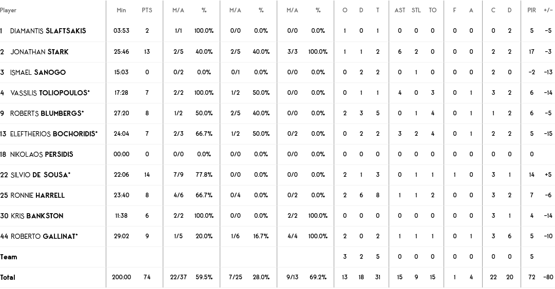 Ξεχώρισαν: Στιπάνοβιτς και Τζόουνς είχαν 18 και 17 πόντους αντίστοιχα, ενώ για τον Άρη, ο Ντε Σ΄όουζα είχε 14 πόντους και ο Σταρκ 13.