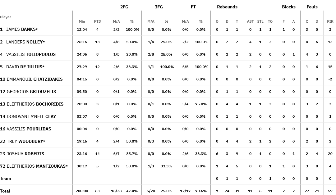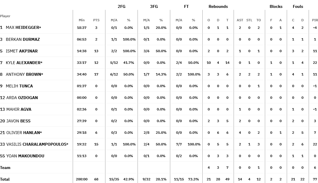 Ξεχώρισαν: Για τους Θεσσαλονικείς ο Ρόμπερτς με 14 πόντους και ο Νόλει με 13, εν΄ω για την Τουρκ ο άτυχος Χαραλαμπόπουλος είχε 15 πόντους.