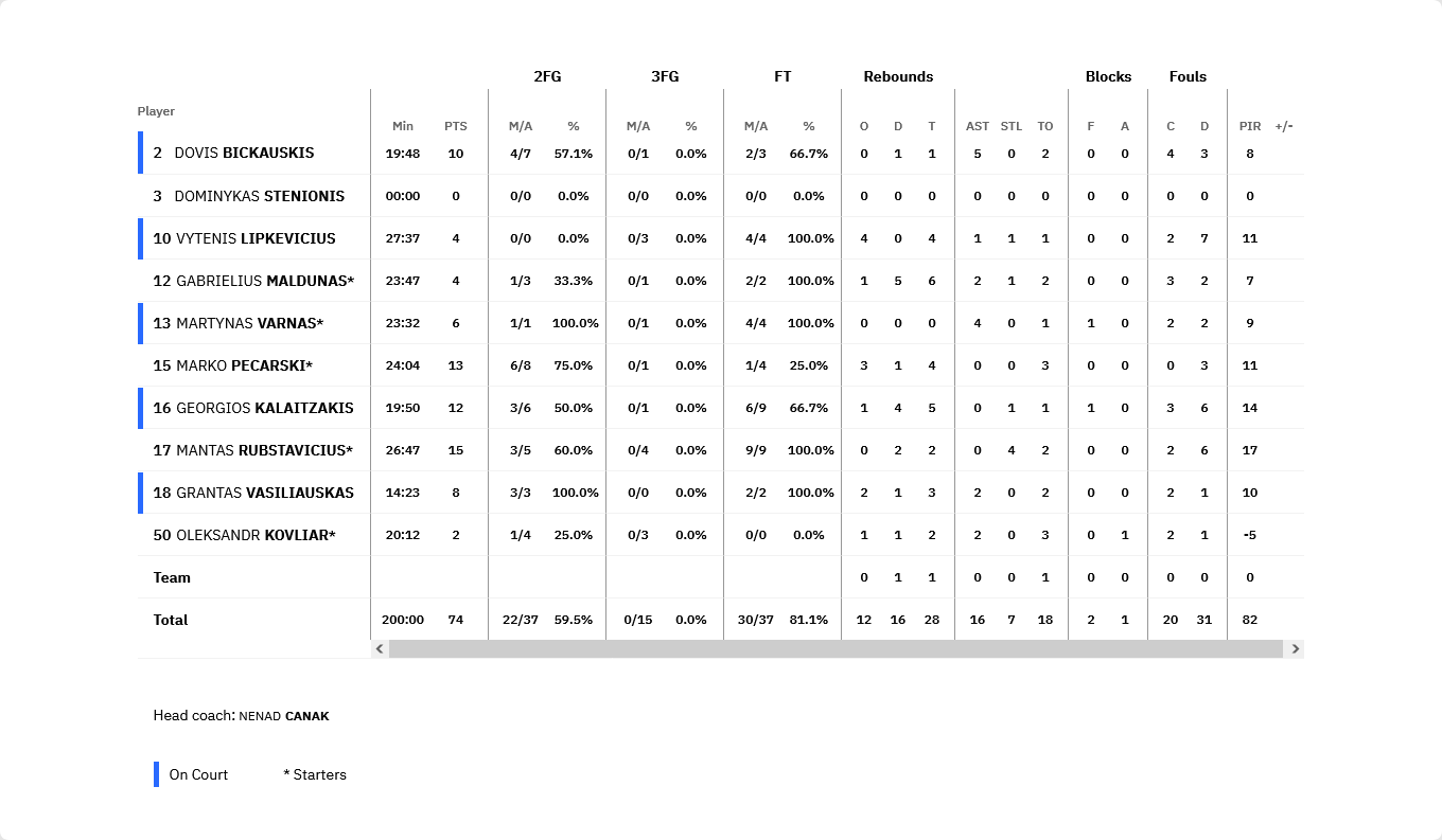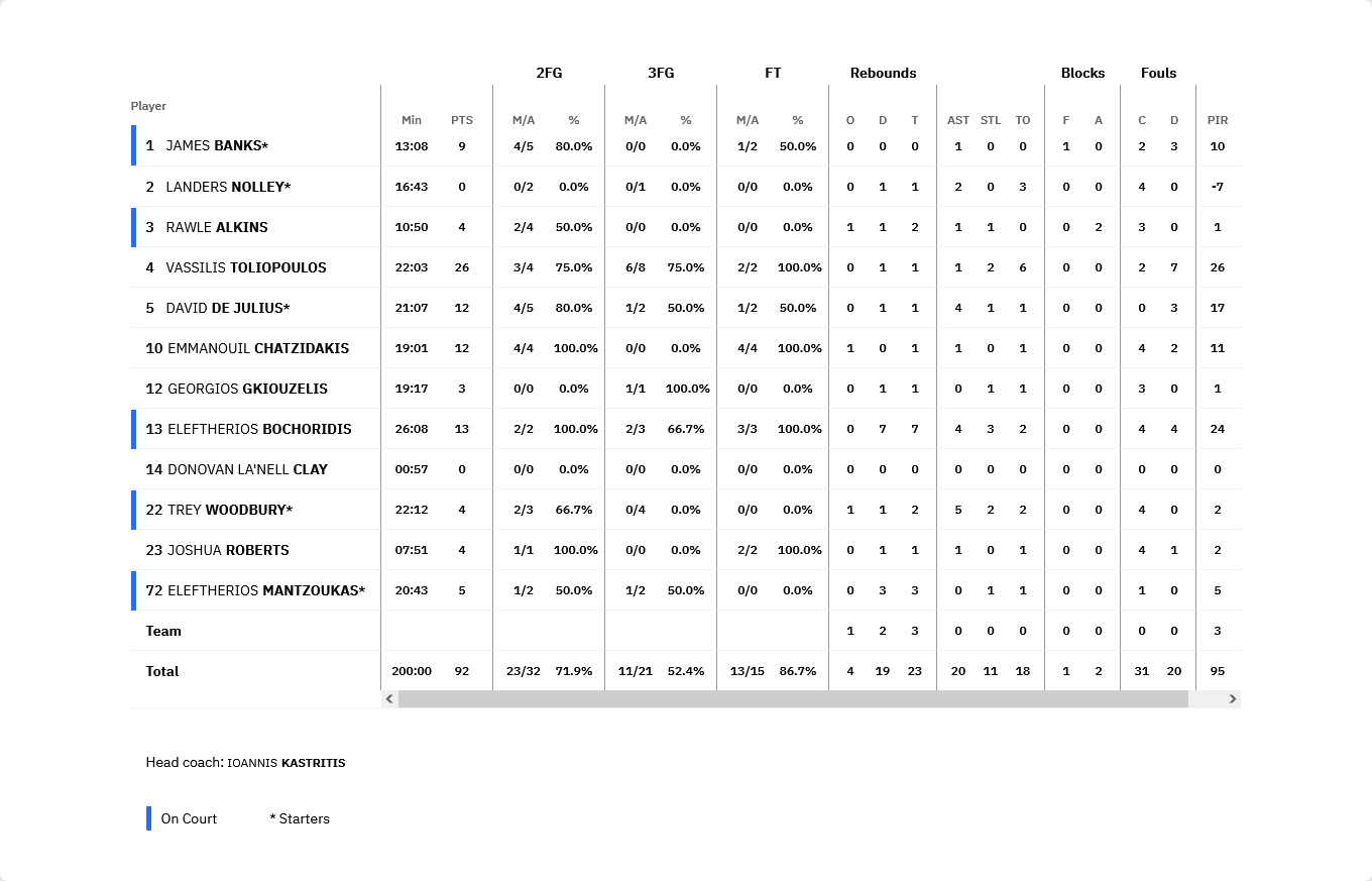 Ξεχώρισαν: Οι Μποχωρίδης με 12 πόντους, 7 ριμπάουντ 4 ασίστ και 3 κλεψίματα μαζί με τον Ντε Τζούλιους ήταν οι συμπαραστάτες του Τολιόπουλου. Από την Λιετκαμπέλις ξεχώρισε ο Ρουμπσταβίτσιους με 15 πόντους, ενώ ο Γιώργος Καλαϊτζάκης σημείωσε 12 πόντους.