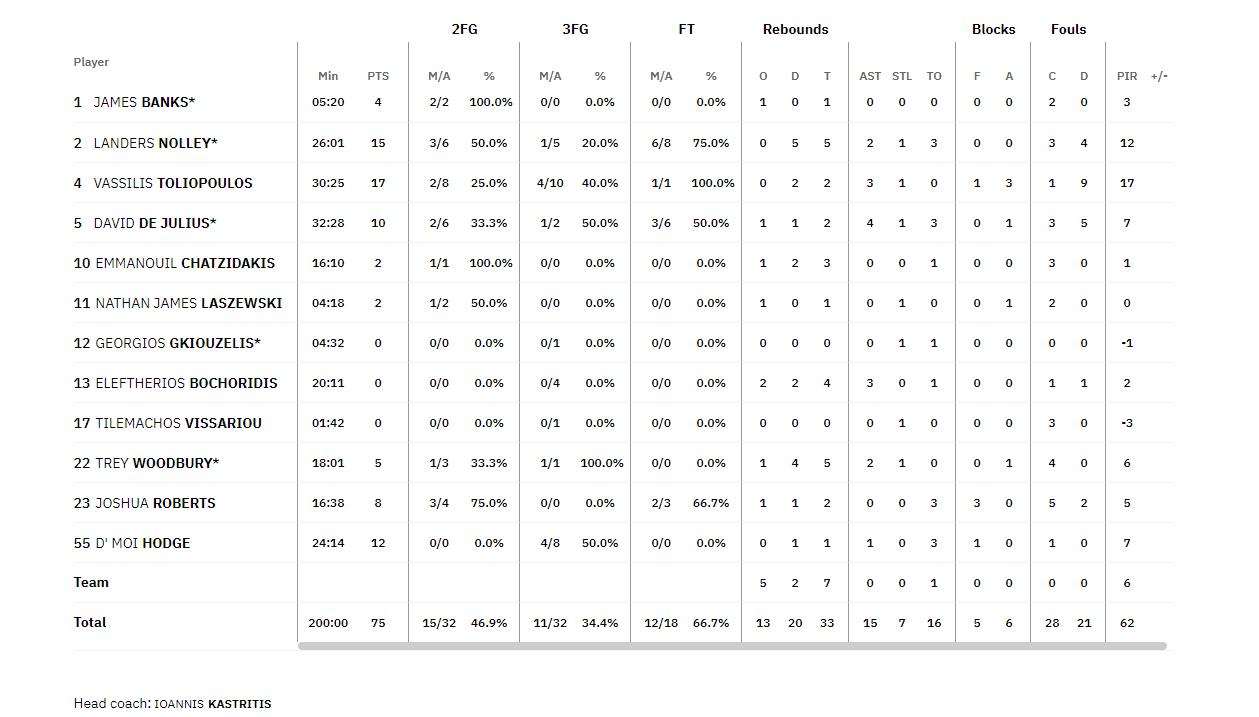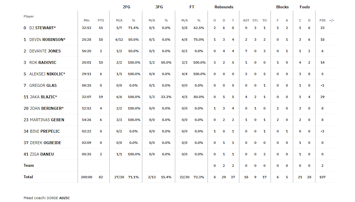 Ξεχώρισαν: Ρόμπινσον με 18 πόντους και Στιούαρτ με 15 πόντους και 8 ριμπάουντ από πλευράς Τσεντεβίτα. Ο Τολιόπουλος με 17 πόντους και ο Νόλεϊ με 15 πόντους και 5 ριμπάουντ διασώθηκαν για τον Άρη.