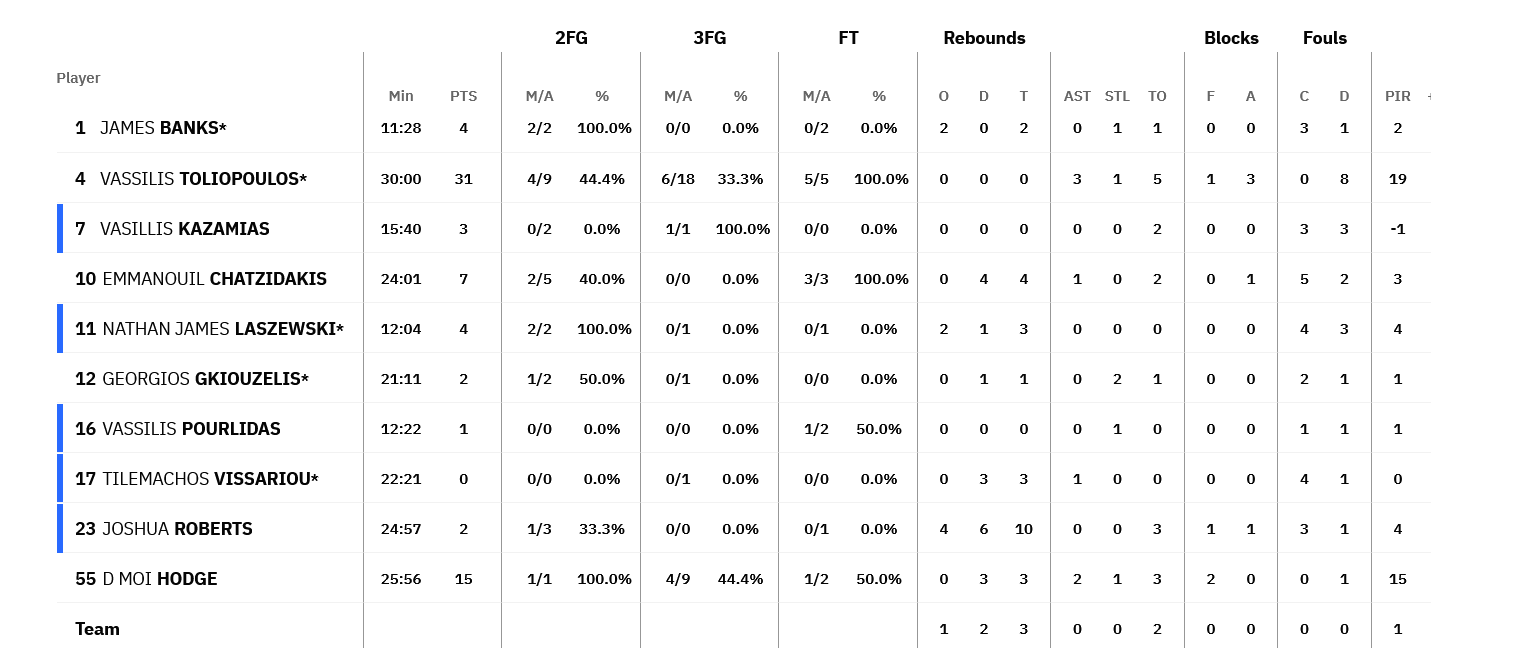 Οn fire: Ο Βασίλης Τολιόπουλος με 31 πόντους (4/9 2π, 6/18 3π, 5/5 βολές) ήταν ο πρώτος σκόρερ του ματς