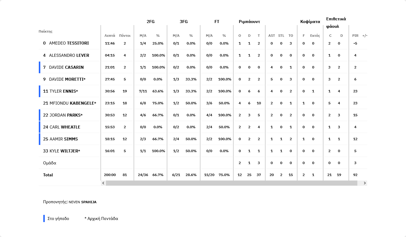 Ξεχώρισαν: Ένις και Καμπενγκέλε με 19 και 18 πόντους ήταν οι πρωταγωνιστές της Βενέτσια, συμπαραστάτες του Γουίλις για τους Θεσσαλονικείς ήταν οι Κούπερ και Νόλεϊ με 19 και 17 αντίστοιχα