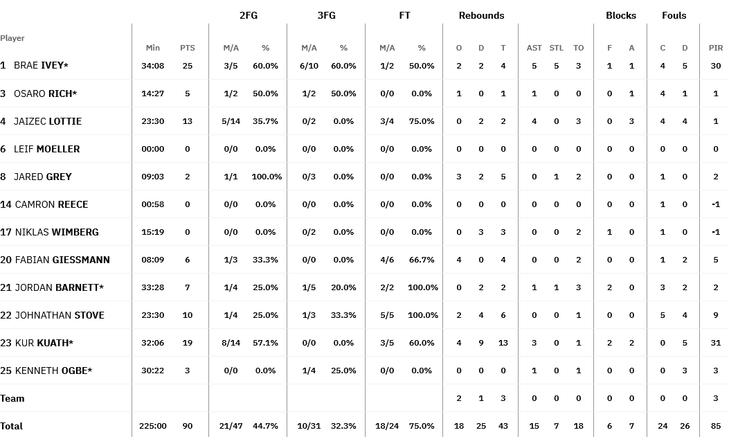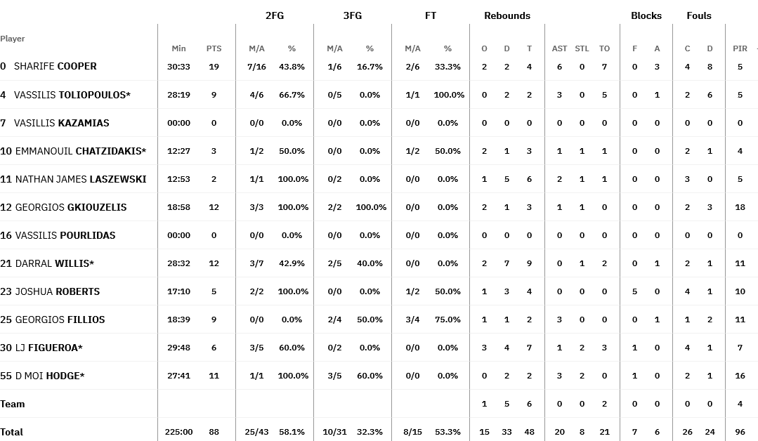 Τα δεκάλεπτα: 22-19, 43-45, 63-62, 84-84 (κ.δ), 90-88 (παράταση)