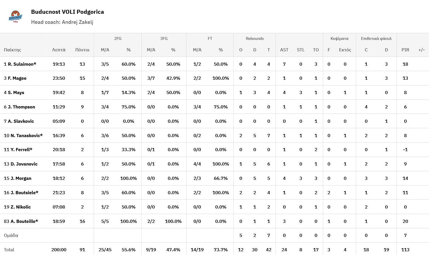 Η μεγαλύτερη διαφορά: +34 για την Μπουντούτσνοστ (85-51) στο 35’