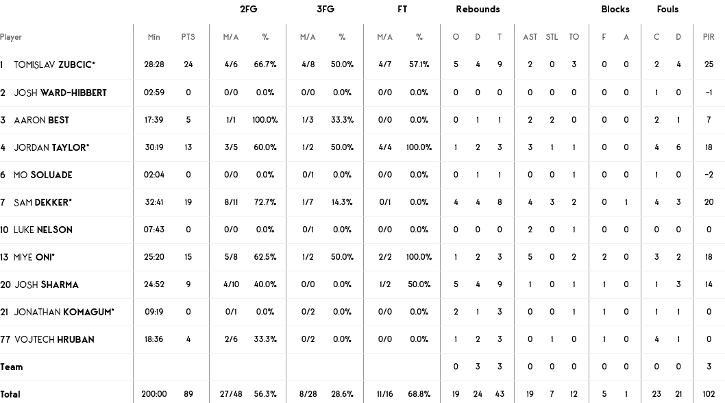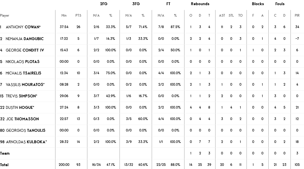 Ξεχώρισαν: 14 πόντους και επτά ριμπάουντ είχε ο Κουλμπόκα και 13 πόντους ο Τόμασον, ενώ για τους Λάιονς, 24 πόντους και εννιά ριμπάουντ είχε ο Ζούμπτσιτς, 19 πόντους ο Ντέκερ και 15 ο Όνι.