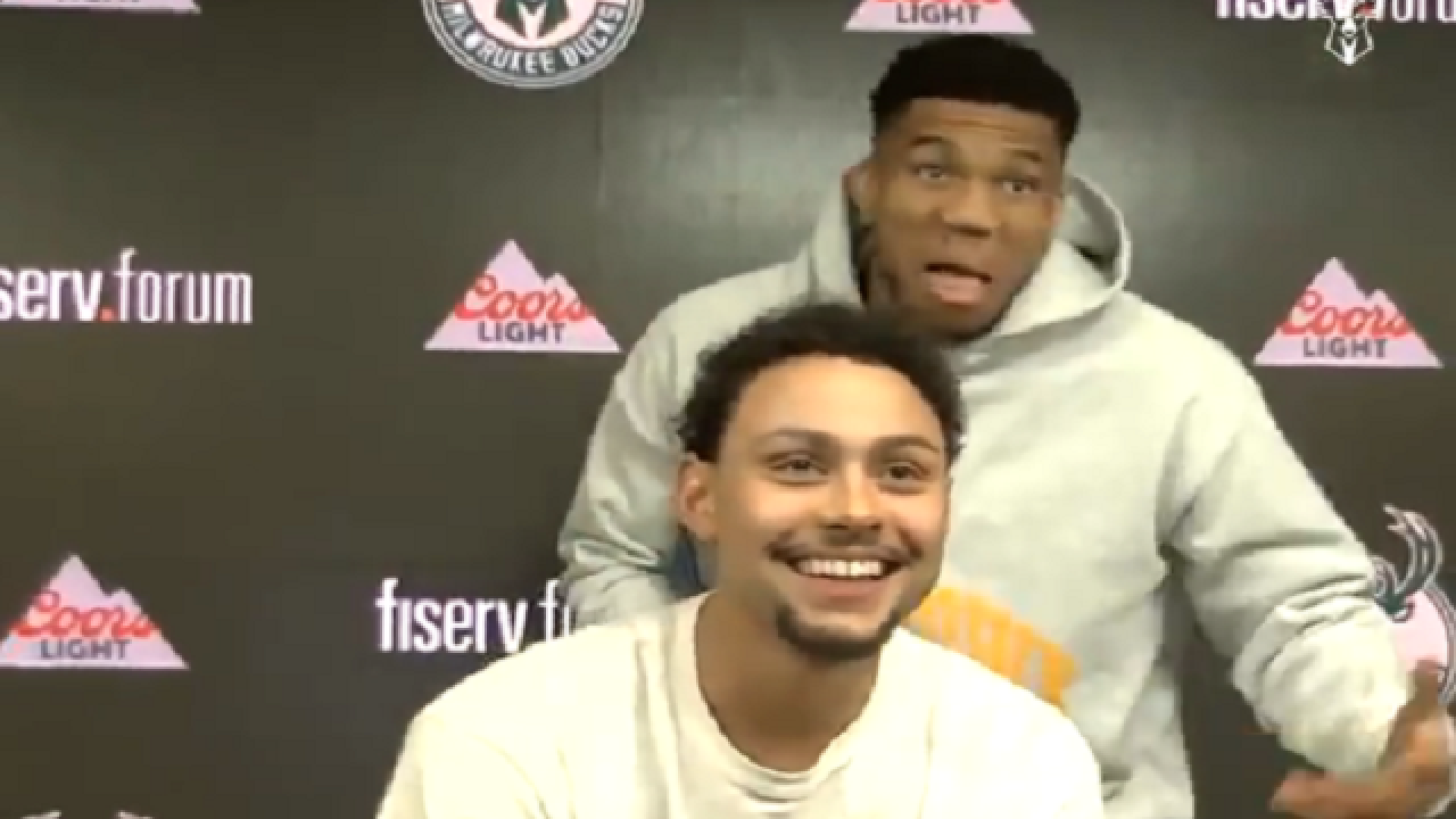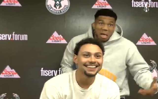Ο Γιάννης Αντετοκούνμπο είχε αρκετή όρεξη για πλάκα και την ώρα που ο συμπαίκτης του, Μπριν Φορμπς μιλούσε στους εκπροσώπους του Τύπου, πέρασε από πίσω και έκανε μερικές γκριμάτσες.