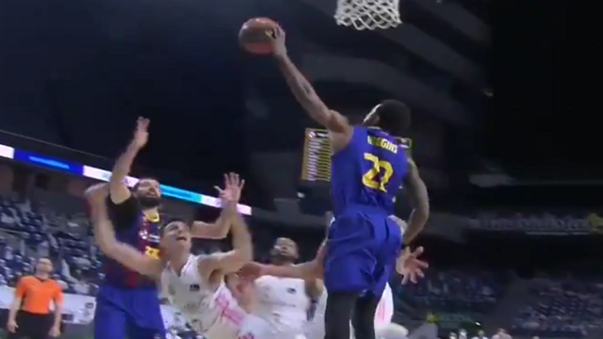 Ο γκαρντ της Ρεάλ, Κάρλος Αλοσέν είχε... πάρει τα βήματα για να κάνει το λέι-απ και να αφήσει την μπάλα στο αντίπαλο καλάθι με το σκορ στο 9-4 στο 5΄, υπολόγισε όμως χωρίς τον Χίγκινς που σηκώθηκε και του έκανε το μπλοκ.