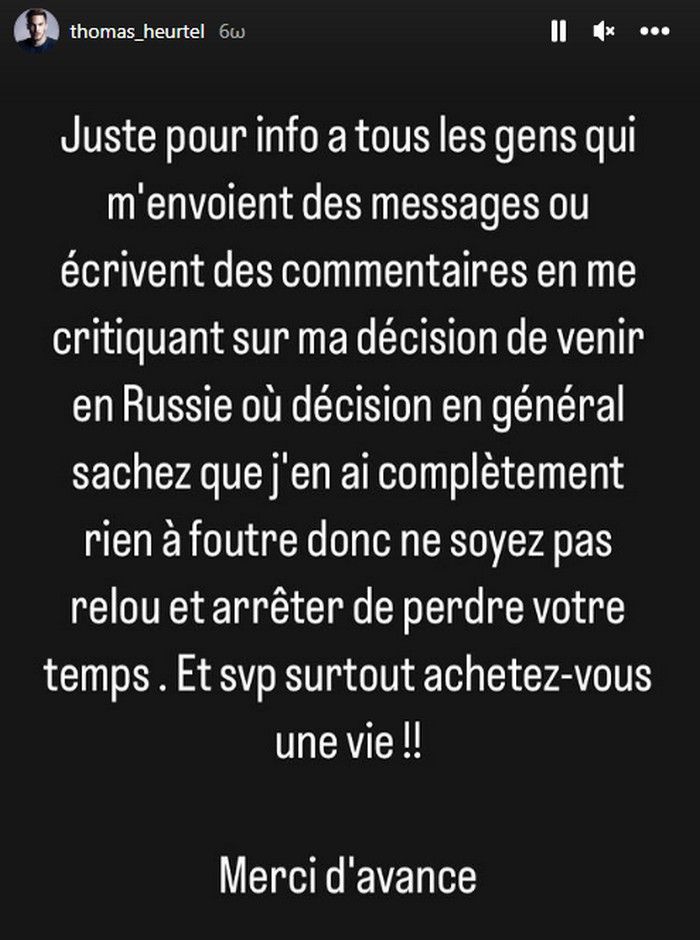 «Προς ενημέρωση όλων αυτών, που είτε μου στέλνουν μηνύματα είτε γράφουν σχόλια, ασκώντας κριτική για την απόφασή μου να παίξω στη Ρωσία ή γενικά, σας παρακαλώ να γνωρίζετε πως δεν με νοιάζει καθόλου η γνώμη σας!