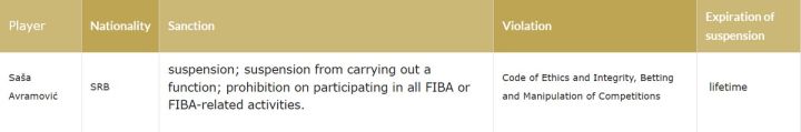 Όπως αναφέρεται στην ιστοσελίδα του BAT, του Διαιτητικού Δικαστηρίου, ο παίκτης της Ίσκρα Σβιτ τιμωρήθηκε σύμφωνα με τον "κώδικα δεοντολογίας και ακεραιότητας, για στοιχηματισμό σε αγώνες".