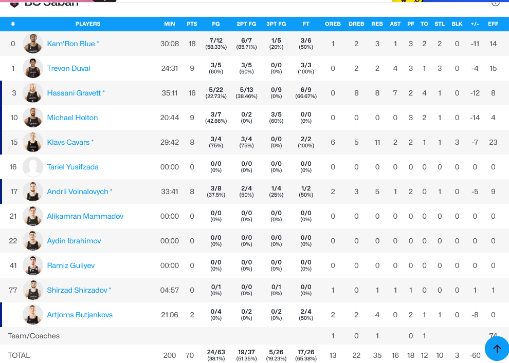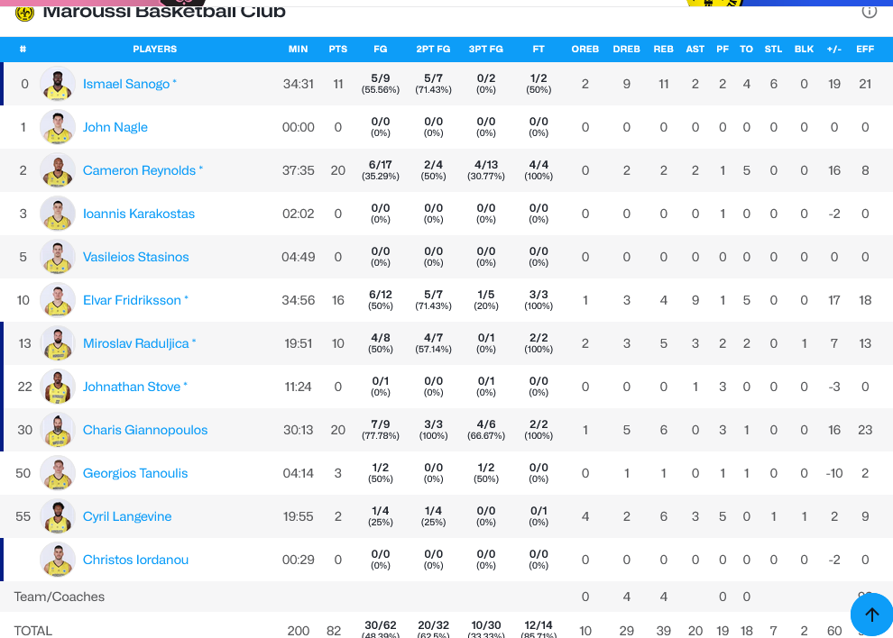 Ξεχώρισαν: 20 πόντους σημείωσε ο Ρέινολντς, με τον Σανόγκο να έχει 11 πόντους και ισάριθμα ριμπάουντ. Για την Σαμπάχ,