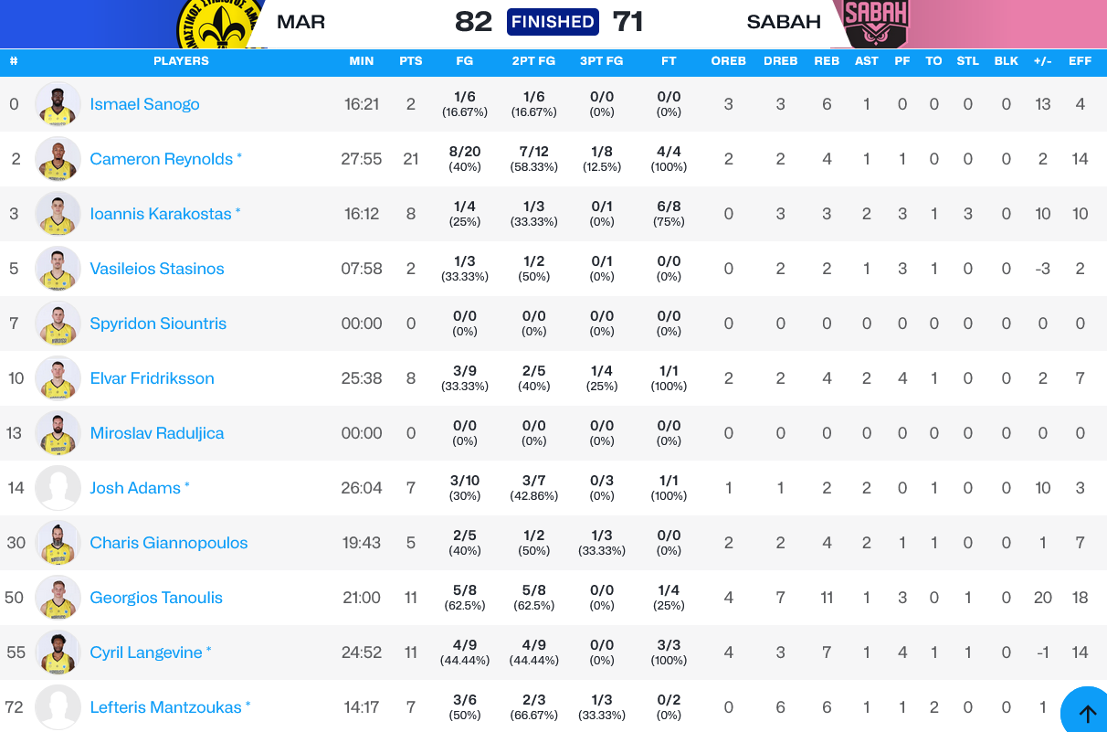 Ξεχώρισαν: Ο Γιώργος Τανούλης που πε΄τυχε double double (11π, 11ρ) μαζί με τον Λάνγκεβαϊν που πρόσθεσε ακόμη 11 πόντους ήταν συμπαραστάτες του Ρέινολντς, ενώ από τους φιλοξενούμενους κορυφαίοι ήταν οι Μπλου και Ντουβάλ με 15 πόντους έκαστος.