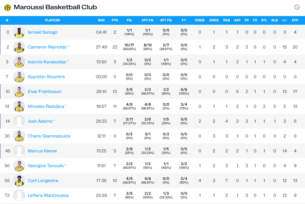 Το Μαρούσι ήταν εξαιρετικό καθόλη τη διάρκεια της αναμέτρησης απέναντι στην Σαρλερουά, δεν άφησε περιθώρια αντίδρασης στους Βέλγους και πανηγύρισε τη νίκη με σκορ 87-70, έχοντας σε πολύ καλό βράδυ τον Ρέινολντς που σημείωσε 22 πόντους.