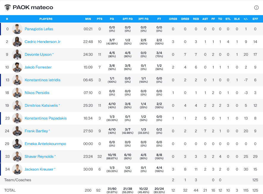 Η μεγαλύτερη διαφορά: +25 για τον ΠΑΟΚ στο 39’ (67-92).