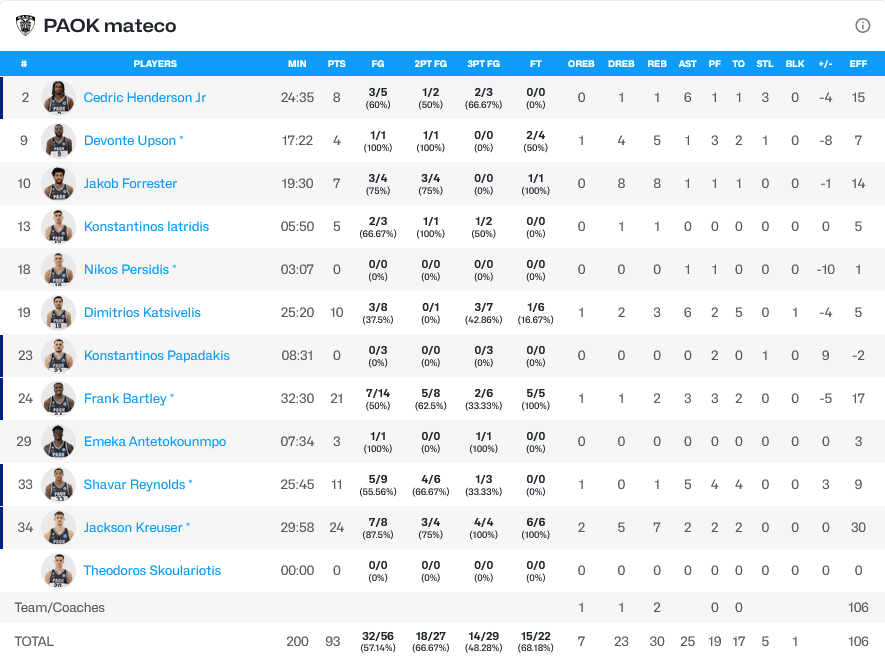 Ξεχώρισαν: Για τους γηπεδούχους ο Χρόβατ με 17 πόντους, ενώ για τον ΠΑΟΚ ο Κρέζερ με 24 πόντους και 7 ριμπάουντ και ο Μπάρτλει με 21