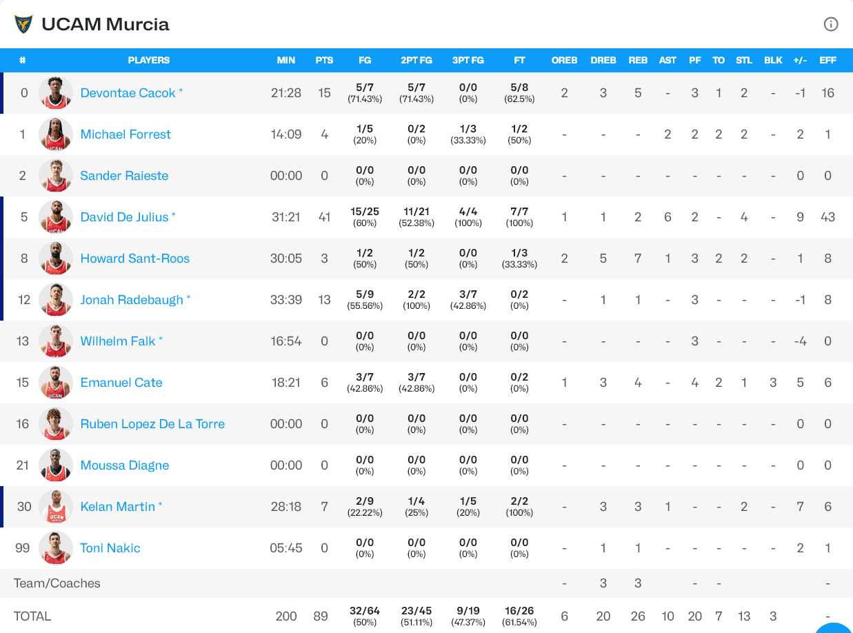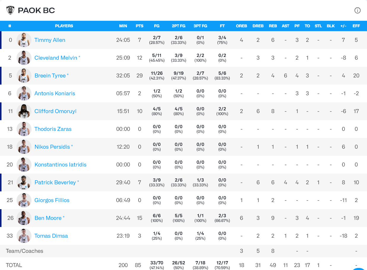 Ξεχώρισαν: Από τον ΠΑΟΚ διακρίθηκαν οι Ταΐρι και Μουρ με 29 και με 15 πόντους αντίστοιχα. Από την Μούρθια έβαλαν οι Κακόκ και Ραντεμπό από 15 και 13 πόντους.