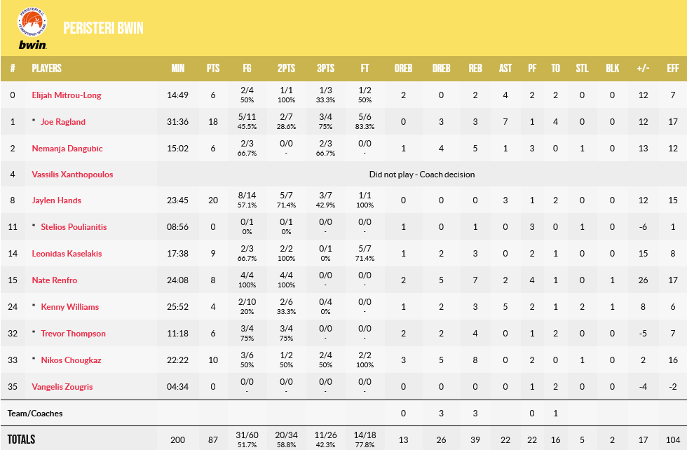 Στο τελευταίο δεκάλεπτο η ομάδα του Βασίλη Σπανούλη έκανε συντήρηση δυνάμεων και χωρίς να απειληθεί καθόλου διαμόρφωσε το τελικό σκορ του αγώνα 87-70.