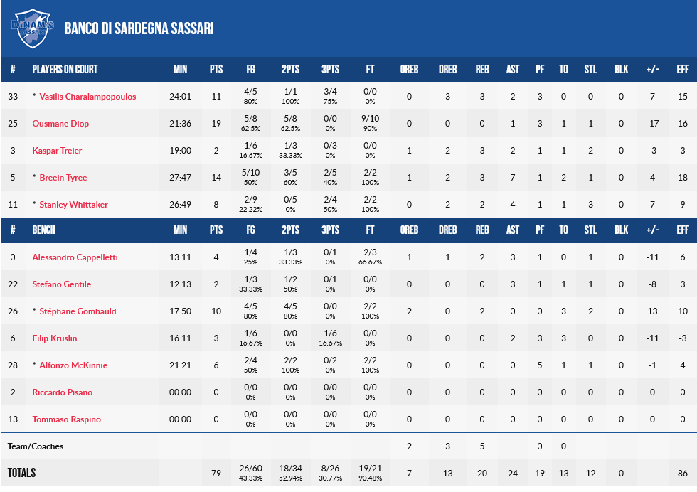 Ξεχώρισαν: Από πλευράς Ένωσης ο Τίλμαν με 20 πόντους και 7 ριμπάουντ και ο Ράντλ με 18 πόντους , 6 ριμπάουντ και 4 ασσίστ , ενώ από πλευράς Σάσαρι ο Ντιοπ με 19 πόντους