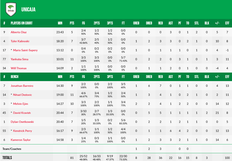 Το Περιστέρι κατάφερε να επιστρέψει από το -18 του 17’ (41-23), να φέρει το παιχνίδι στο -6 (49-43 στο 25’), όμως ένα 10-0 από πλευράς γηπεδούχων για το 59-43… τελείωσε το ματς, με την Μάλαγα να φτάνει στην νίκη με 81-64.