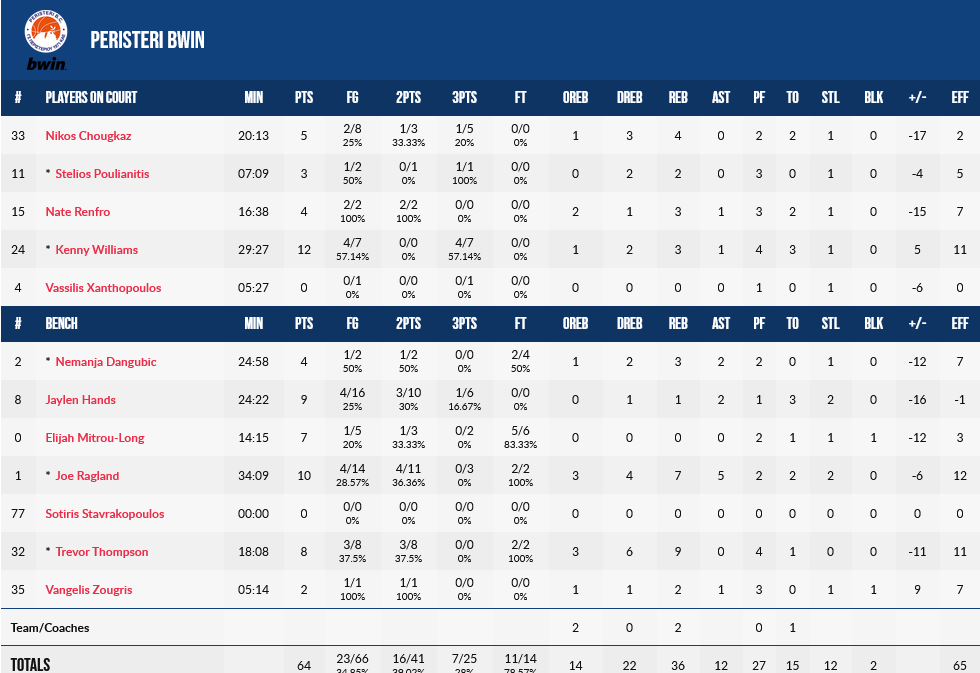 Ξεχώρισαν: Σίμα Ντέντοβιτς σημείωσαν από 11 πόντους έκαστος για τους νικητές. Από πλευράς Περιστερίου, εκτός του Γουίλιαμς, ο Ράγκλαντ είχε 10 πόντους.