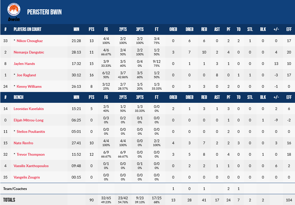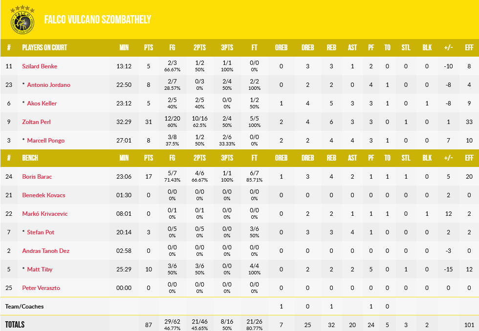 Ξεχώρισαν: Ράγκλαντ και Χαντς είχαν 16 και 15 πόντους αντίστοιχα, ενώ ο Ντάγκουμπιτς είχε 11 πόντους και 10 ριμπάουντ. Για την Σομπατέλι, 17 πόντους είχε ο Μπάρατς και 10 ο Τίμπι.