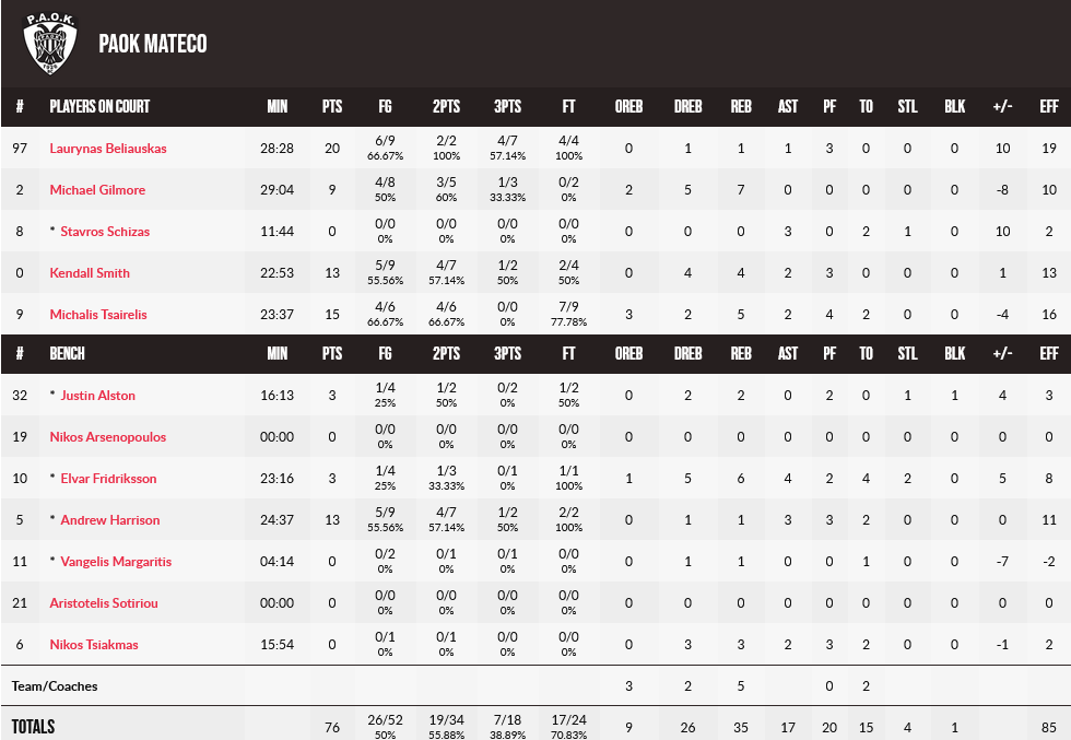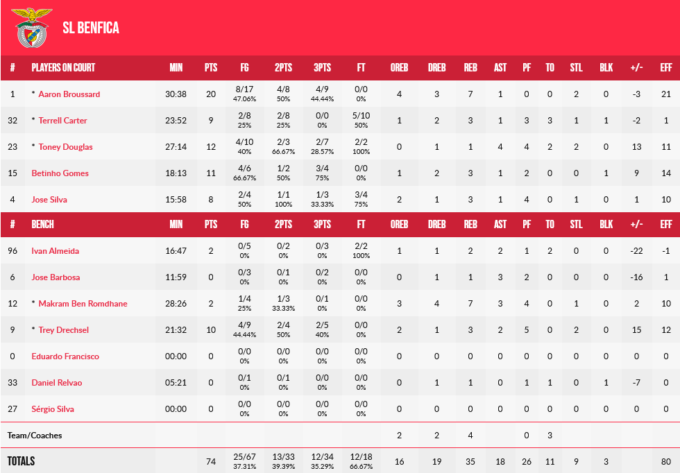 Ξεχώρισαν: 15 πόντους πέτυχε ο Τσαϊρέλης και από 13 οι Χάρισον και Σμιθ. Για την Μπενφίκα, 20 πόντους σημείωσε ο Μπρουσάρντ.