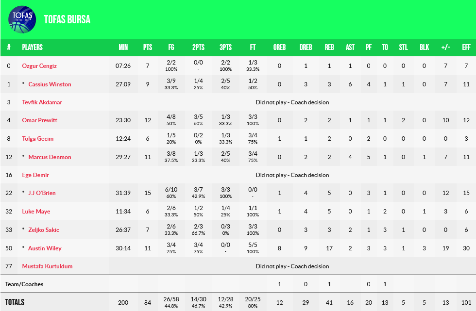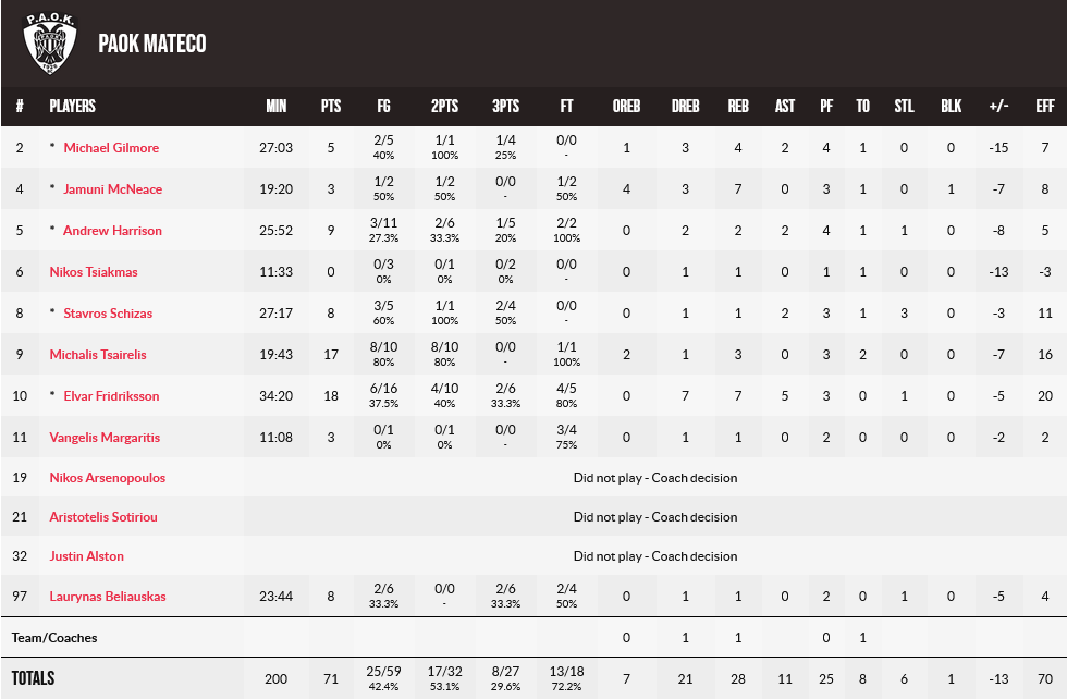 Ξεχωρίσαν: Από μεριάς γηπεδούχων ο Τσαιρέλης με 17 πόντους και ο Φρίντικσον με 18 ήταν αυτοί που τράβηξαν το "κουπ΄ι" για τον ΠΑΟΚ, εν΄ω από τους φιλοξενούμενους ο Προύιτ είχε 12 πόντους.