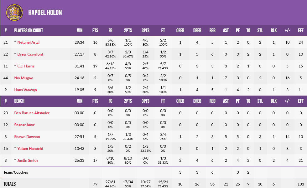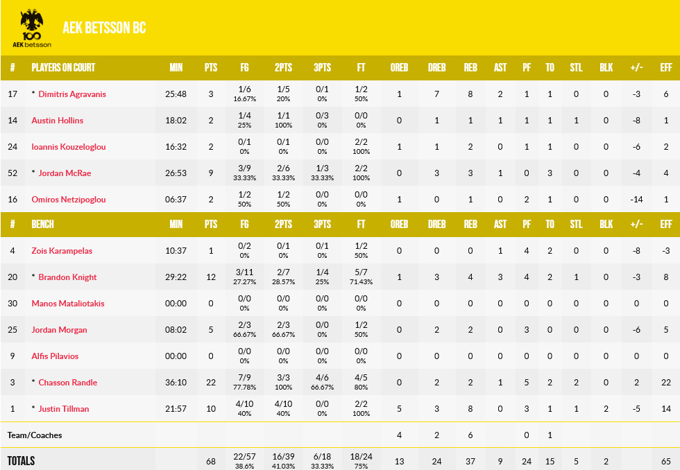 Ξεχώρισαν: Χάρις με 19 πόντους, Σμιθ με 17 και Άρτζι με 16, ήταν οι κορυφαίοι της Χάποελ. Για την ΑΕΚ, εκτός του Ραντλ, ο Νάιτ είχε 12 πόντους και ο Τίλμαν 10.