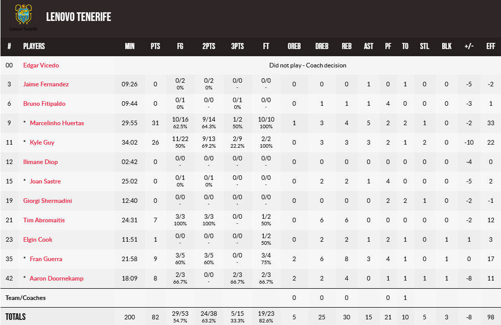 Ξεχώρισαν: Ο Λεωνίδας Κασελάκης με 18 πόντους 4/7 τρίποντα και ο Τζο Ράγκλαντ με double double (15 πόντους,14 ασίστ). Για την Τενερίφη ο αγήραστος Χουέρτας σημείωσε 31 πόντους και ο Γκάι 26.