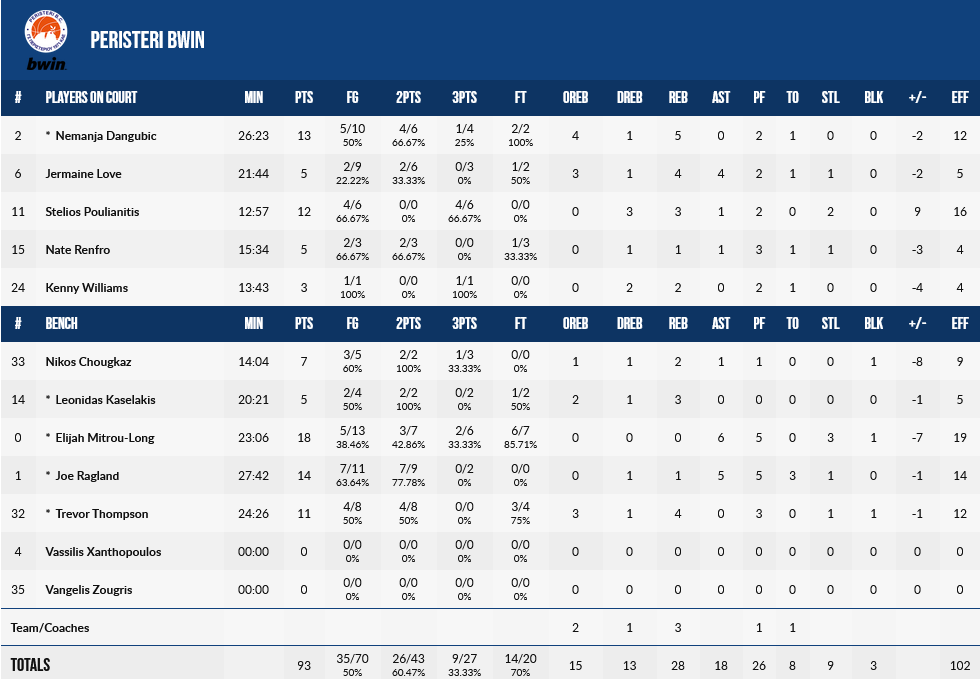 Ξεχώρισαν: Συγκλονιστικός ο 41χρονος Χουέρτας με 27 πόντους, εννέα ριμπάουντ και επτά ασίστ, ενώ ο Σερμαντίνι τελείωσε το παιχνίδι με 21 πόντους. Για το Περιστέρι, ο Μήτρου – Λονγκ είχε 18 πόντους, ο Ράγκλαντ 14, ο Ντάνγκουμπιτς 13, ενώ η αποκάλυψη ήταν ο Πουλιανίτης με 12 και συνεχόμενα τρίποντα που λίγο έλειψε να γυρίσουν ένα χαμένο παιχνίδι.