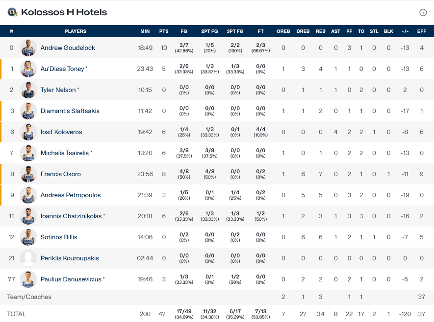 Ξεχώρισαν: 13 πόντοι ήταν ο απολογισμός του Φιτιπάλντο, ενώ για τον Κολοσσό, ο Γκάουντλοκ είχε 10 πόντους.