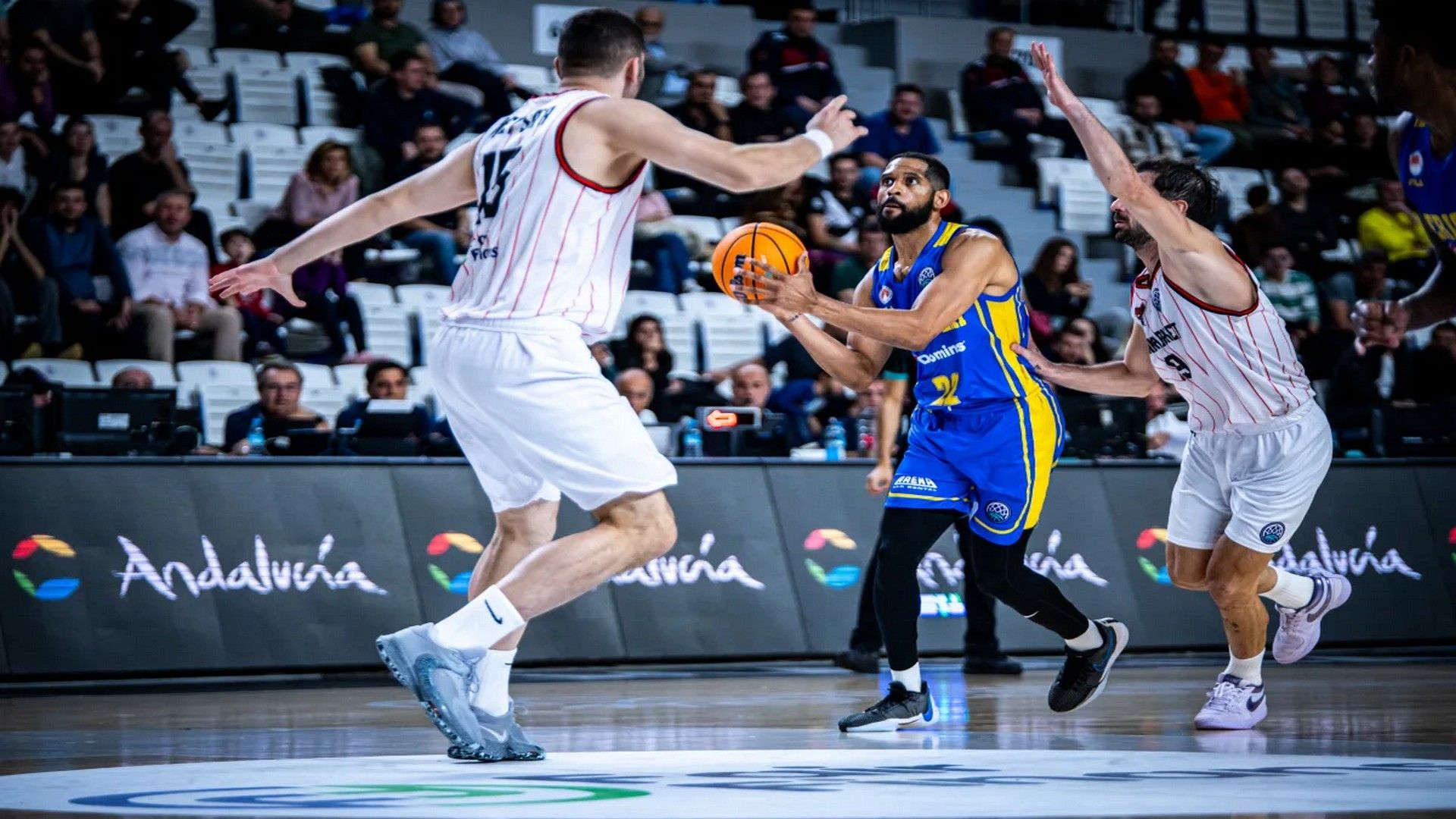 Ιδιαίτερα εύστοχο ήταν το Περιστέρι έξω από τα 6.75 στην αρχή του ματς που με τα συνεχόμενα τρίποντα των Έντι, Πουλιανίτη και Κόφι πήρε προβάδισμα οκτώ πόντων (6-14), με τους γηπεδούχους με ένα επιθετικό ξέσπασμα δια χειρός Μπράουν να γυρνά το ματς σε 21-16, αλλά Ζούγρης και Πάππας έφεραν ξανά μπροστά τους φιλοξενούμενους στο τέλος της περιόδου (21-23). Στο δεύτερο δεκάλεπτο, Γουάιτ, Μπεσόν και Γιαγμούρ βρήκαν λύσεις στο σκοράρισμα για τους Τούρκους και έβαλαν μπροστά την Μανίσα με σκορ 35-30. Οι γηπεδούχοι εκμεταλλεύτηκαν το προβάδισμά τους μέχρι το τέλος του ημιχρόνου και πήγαν στα αποδυτήρια όντας μπροστά με σκορ 44-40.